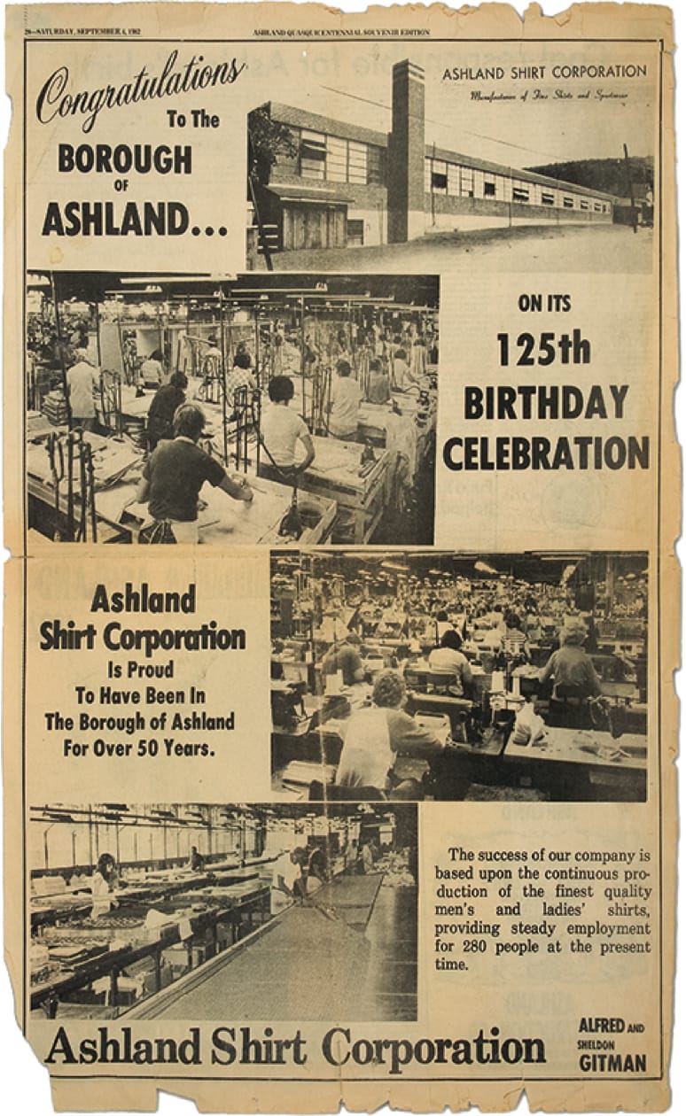 In the roaring twenties and soon after The Great Depression, several great shirt makers, mostly first generation immigrants, banded together to move en masse out of New York and away from its urban problems, high costs and rackets. They decided upon a rural area about four hours outside of New York City in Pennsylvania, either in or around Schuylkill County. Among them was Max Gitman, a Brooklyn native who moved his family and business to the coal-mining town of Ashland and established the Ashland Shirt & Pajama Company in 1932.